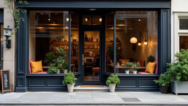 Outdoor storefront mockup of a coffee shop with plants and seating outside, creating a welcoming atmosphere.
