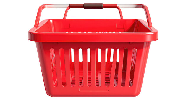 Front-facing view of empty, bright red shopping basket on black background with clear handles, indoor lighting
