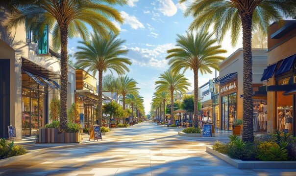 Outdoor shopping center with palm trees, shops, and a sunny ambiance, creating a warm, inviting retail environment for visitors.