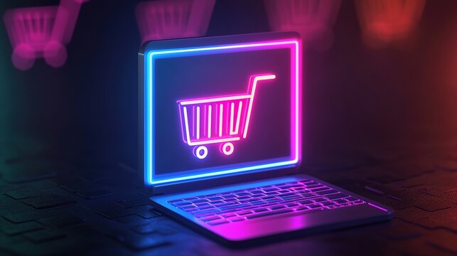 A glowing laptop displays a neon shopping cart, representing online shopping and digital commerce in a vibrant, futuristic setting.