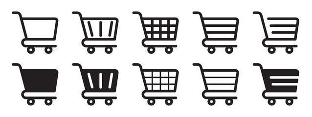 Shopping cart icon vector set. Retail supermarket trolley symbol. Simple grocery basket line icon set. Online purchase or buy cart sign. Add to cart symbol.