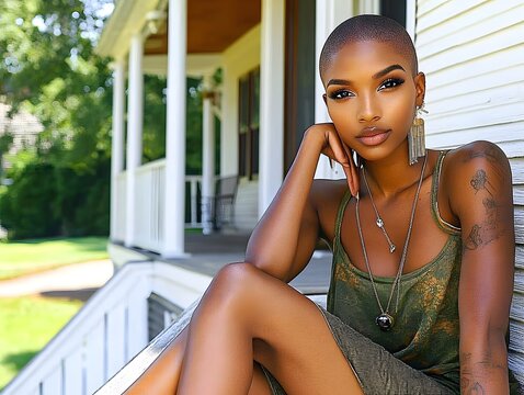 beautiful slender female legs. A woman in a short skirt and beige fishnet tights is sitting on the stairs near the Christmas tree