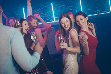 Birthday day occasion holiday event loud sound concept. Photo of excited crazy carefree in short mini dress formal wear ladies guys enjoying wine glass beverage dancing on dj music
