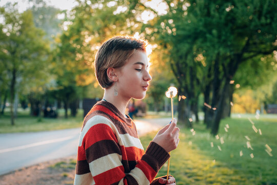 Teenage girl with short hair blowing on dandelion in the park