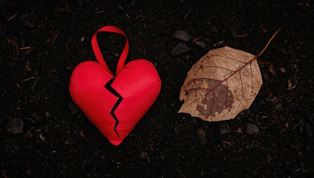 A heart-shaped plush toy rests on dark soil next to a dried leaf, representing lost love and heartbreak, emotional storytelling