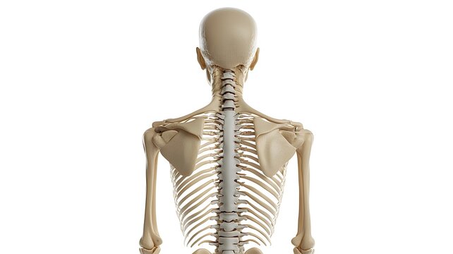 A rear view of a human skeleton showcasing the spine and shoulder blades.