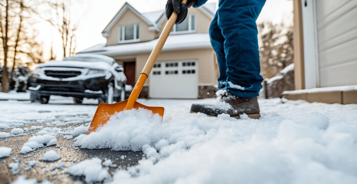Winter morning snow removal: shoveling driveway in suburban neighborhood