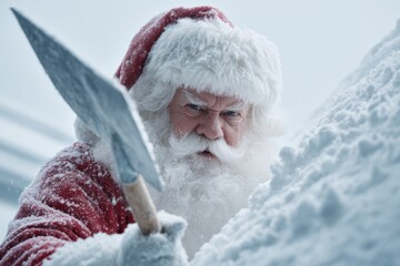 Santa is busy shoveling snow in front of his workshop during the winter. His red outfit contrasts with the white snow, showing his dedication to keeping everything clear