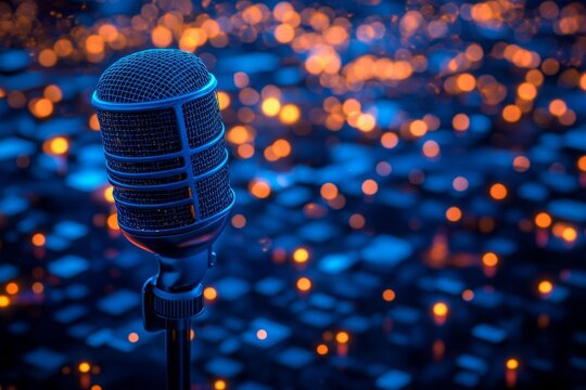 Purple stage with award ceremony spotlight background, festive sparkling stars, glowing projector rays and shimmering glitter particles on dark bg. Winners announcement or luxury event decoration.