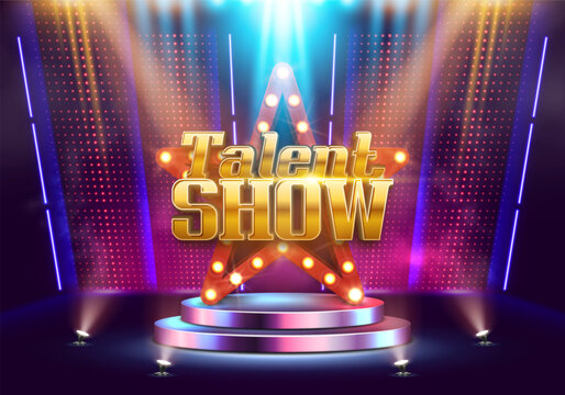 Bright Talent Show sign with star on podium illuminated by neon lights and spotlights. Vector illustration.