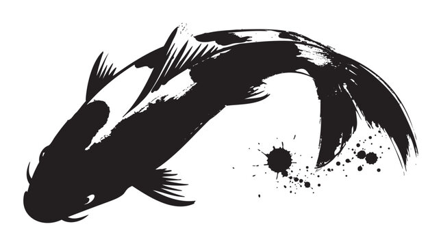 Black silhouette of a koi fish with splatter effect, showcasing detailed fins and a dynamic curved body in an artistic style.