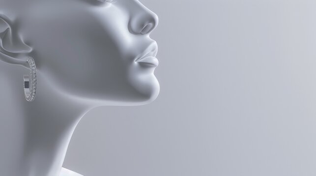 Three-dimensional rendering of a female abstract white profile and elegant mannequin gesture, woman silhouette sculpture, earrings display concept, jewelry showcase concept, and earring display.