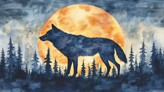 Design a mesmerizing watercolor artwork showcasing a wolfs silhouette overlaid with a moonrise