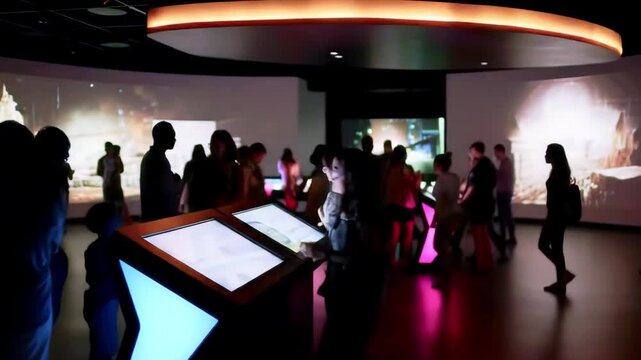 Visitors engaging with an interactive exhibit in a modern museum showcasing immersive visuals