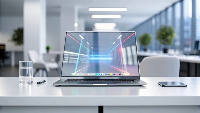 Modern office desk with futuristic transparent laptop and phone showcasing bright office environment