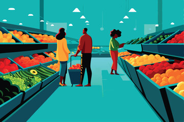 Create a vibrant illustration of a bustling supermarket interior, showcasing diverse customers actively selecting groceries from well-stocked shelves.