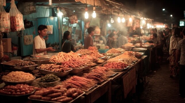 Culinary delights at a vibrant Asian night market showcasing diverse foods