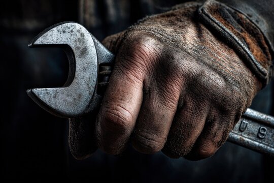 Close-up of a weathered hand gripping a wrench, showcasing the hard work and dedication of a skilled worker.