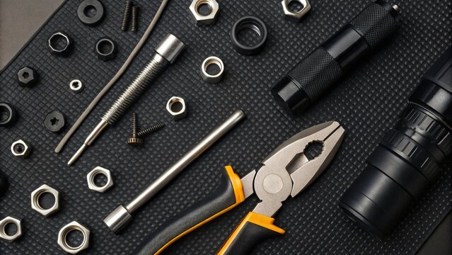 An overhead flat lay showcasing a variety of workshop tools and hardware components, including pliers, nuts, bolts, and various fasteners, meticulously arranged on a dark