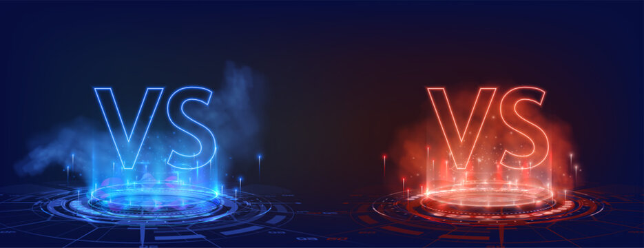 Epic Versus Battle Arena with Neon VS Sign. Two glowing neon 'VS' signs in blue and red on a dark digital arena setting, symbolizing an epic showdown or competition. Vector