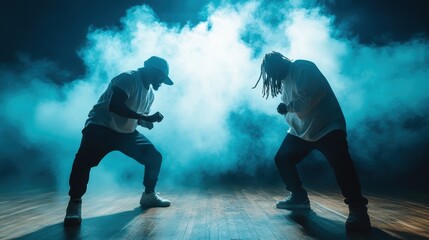 Two silhouetted figures engage in a dynamic dance showdown amidst a thick fog, conveying a sense of mystery and creativity in this captivating artistic performance.