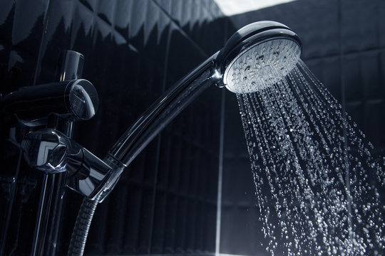 Unfocused naked woman showering, bathing and washing long hair in shower under refreshing water jet at home