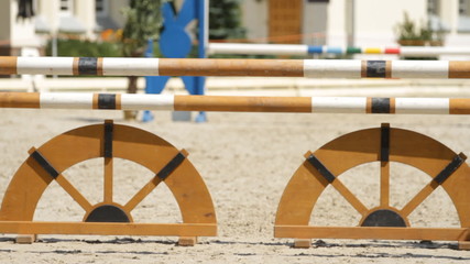 Horse jumping over obstacle on sandy parkour riding arena equestrian competition