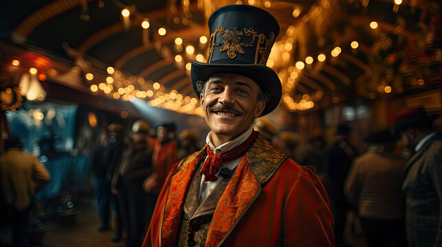 Portrait of a showman in costume at circus. Vintage portrait of male retro circus entertainer.