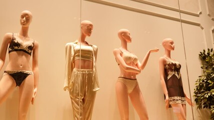 Mannequins with fashion underwear standing behind glass showplace frontage in shopping center