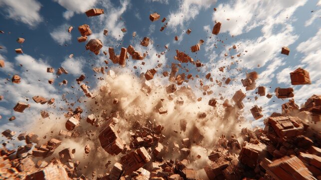 explosion of brick fragments in the air against a cloudy sky symbolizing destruction demolition or the power of impact