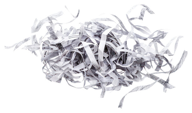 A stack of papers is being shredded with papers flying upwards and out of the shredder creating an abstract art piece.
