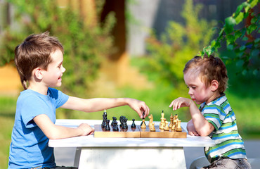 children started the classic a chess match outdoors. two young chess players outdoors. the concept of education