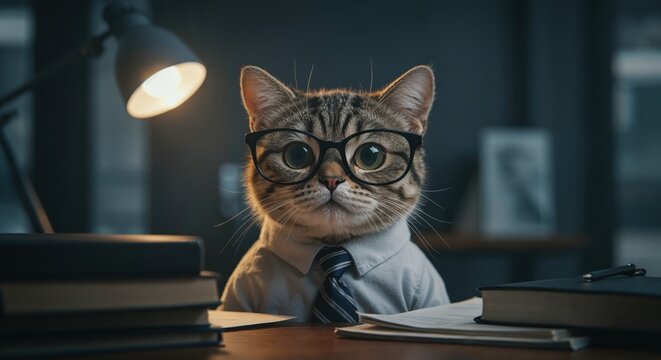 Business Cat Contemplating: A shrewd cat, donning spectacles and a smart tie, occupies a desk, lost in thought amidst stacks of documents and the soft illumination of a desk lamp.