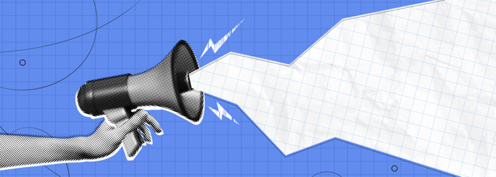 Trendy Halftone Collage Hand with Megaphone and paper cut out space for announcing promotion. Social media communication and adverting. Online news. Contemporary vector illustration art