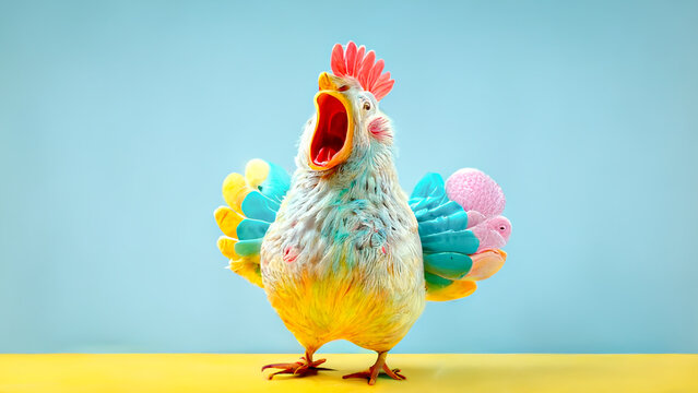 squawking chicken or squeaky toy are shouting and copy space pastel background. Generative AI illustration