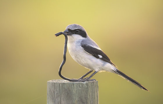 Wild loggerhead shrike (Lanius ludovicianus) with snake prey in Florida