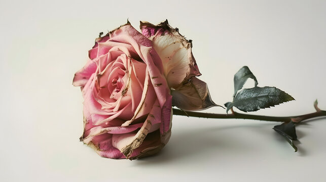A solitary withered pink rose on white backdrop symbolizing loneliness and sorrow