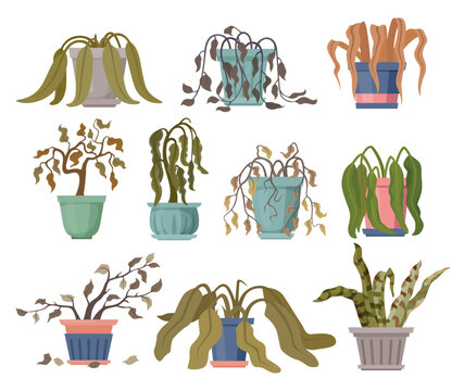 Withered houseplant in pot leaves droop hang foliage lifeless dead flower set vector flat
