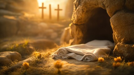 shroud in the church, the interior of the church at night with the shroud decorated with flowers, Easter Friday