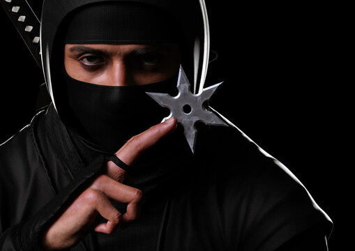 Close-up of a ninja holding a shuriken in the dark. Traditional ninja style. 3d illustration.
