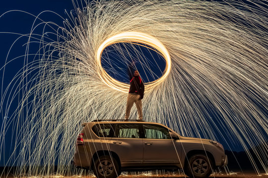 Colorful Light Trails of a Bus Captured with Long Exposure and Motion Blur Against a Dark Background, Isolated in the Foreground with Ample Copy Space for Design Use