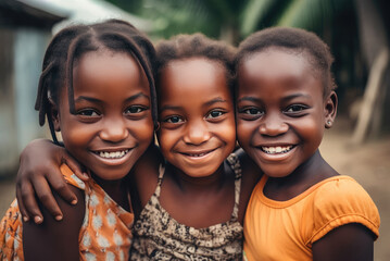 Three girls, friends, african, embraced smiling and looking at camera. Generative AI