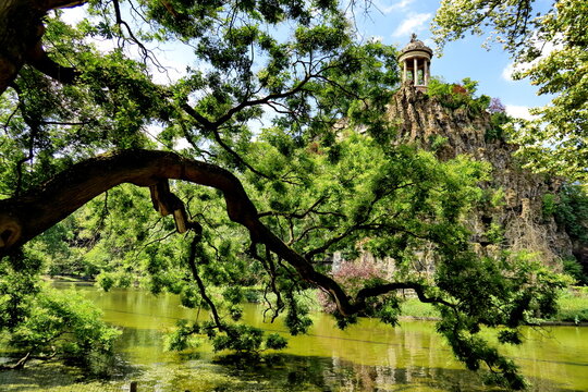 Paris, France - 07 27 2025: Park Buttes-Chaumont. Panoramic view of The Japanese Sophora tree, the belvedere island, Temple of the Sibyl and the lake behind