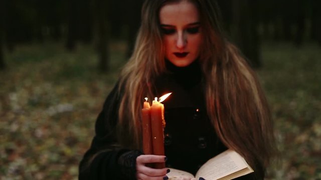 Witch with a book and candles in the forest