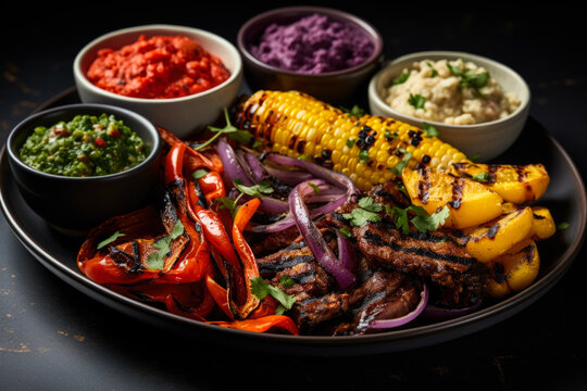 Grilled food with colorful sides