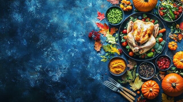 Turkey and Side Dishes on Blue Background for Thanksgiving