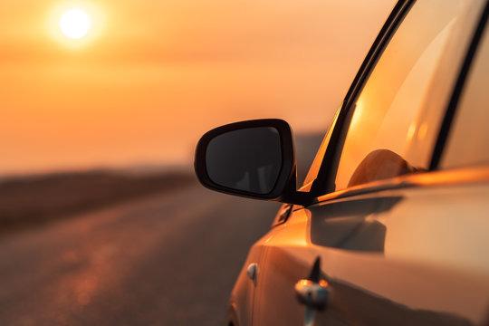 Reflection seen through car side mirror -  two-lane winding road with twilight sky and sunset