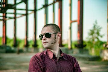 A man in a plaid shirt and sunglasses with sideburns in an abandoned building for demolition walks in military boots