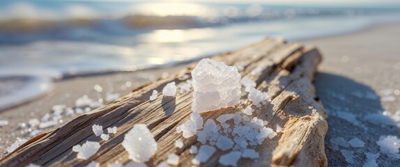 Natural sea salt crystals resting on a weathered piece of driftwood by the shore during a sunny day