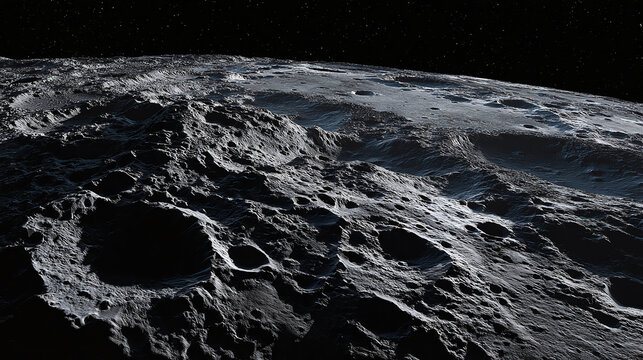 A detailed view of the lunar surface featuring craters and a starry sky in the background.